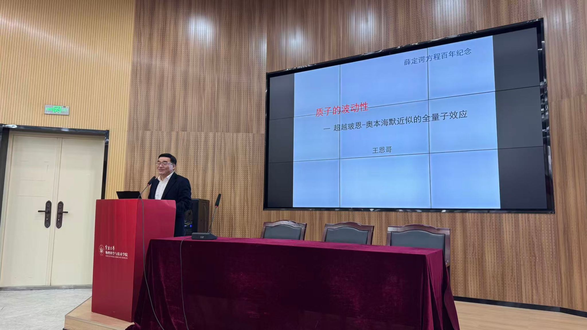 3月31日,物理科学与技术学院在龙赛报告厅举办“格物·鼎新——宁波大学40周年庆物理前沿系列高峰讲坛”首场报告中国科学院院士北京大学教授王恩哥应邀为学院师生作题为超越玻恩-奥本海默近似的全量子效应研究的学术报告。本次报告校长蔡荣根院士主持,学院党政班子成员及200余名师生参加